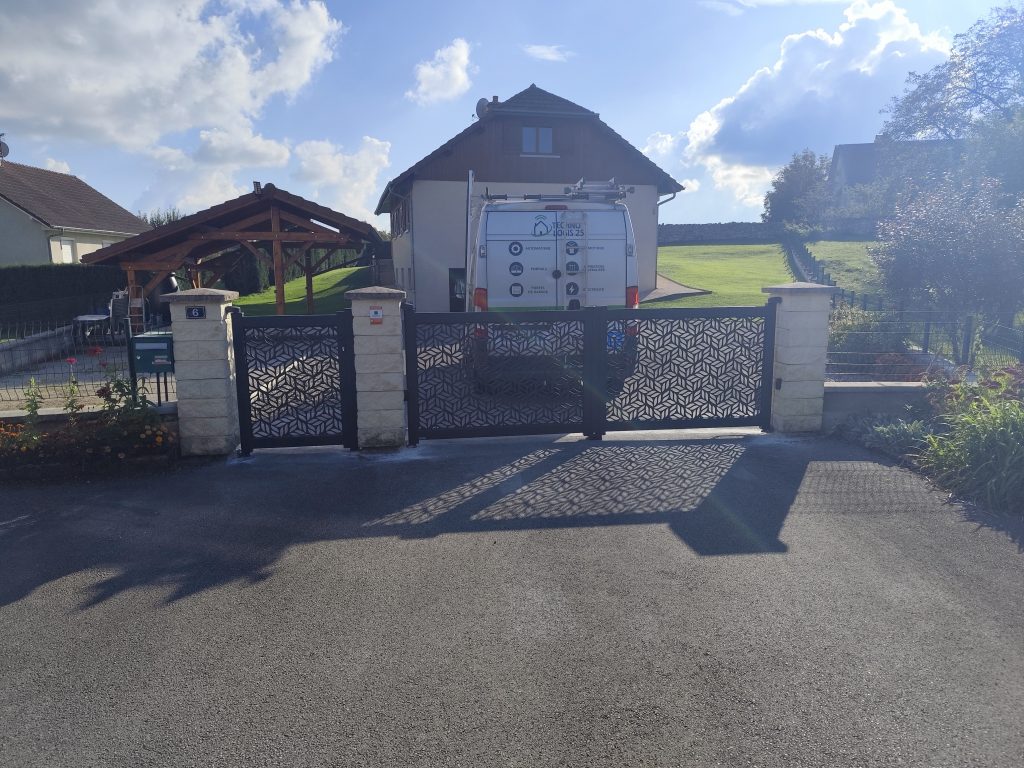 Ensemble portail battant motorisé et portillon manuel Fabrication sur-mesure respectant la maçonnerie existante Portail dans la gamme personnalisable avec tôle en découpe laser