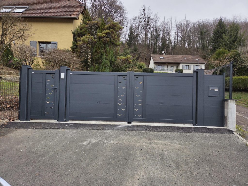 Ensemble complet portail battant motorisé / Ouverture extérieure avec motorisation intérieure Portillon manuel et élément de clôture avec boite aux lettres intégrées L’ensemble dans un décor découpe laser choisi par le client Belle réalisation !!!