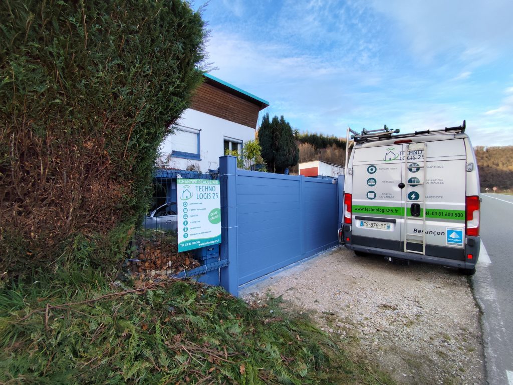 Fourniture et pose d’un portail coulissant motorisé Dimensions : Largeur 4000 x Hauteur 1800 mm Coloris BLEU PIGEON RAL 5014 Maçonnerie réalisée par notre partenaire RCTB à Pont-Les-Moulins